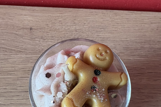 Bougie gourmande de Noël senteur pain d’épices décorée d’un bonhomme pain d’épices.